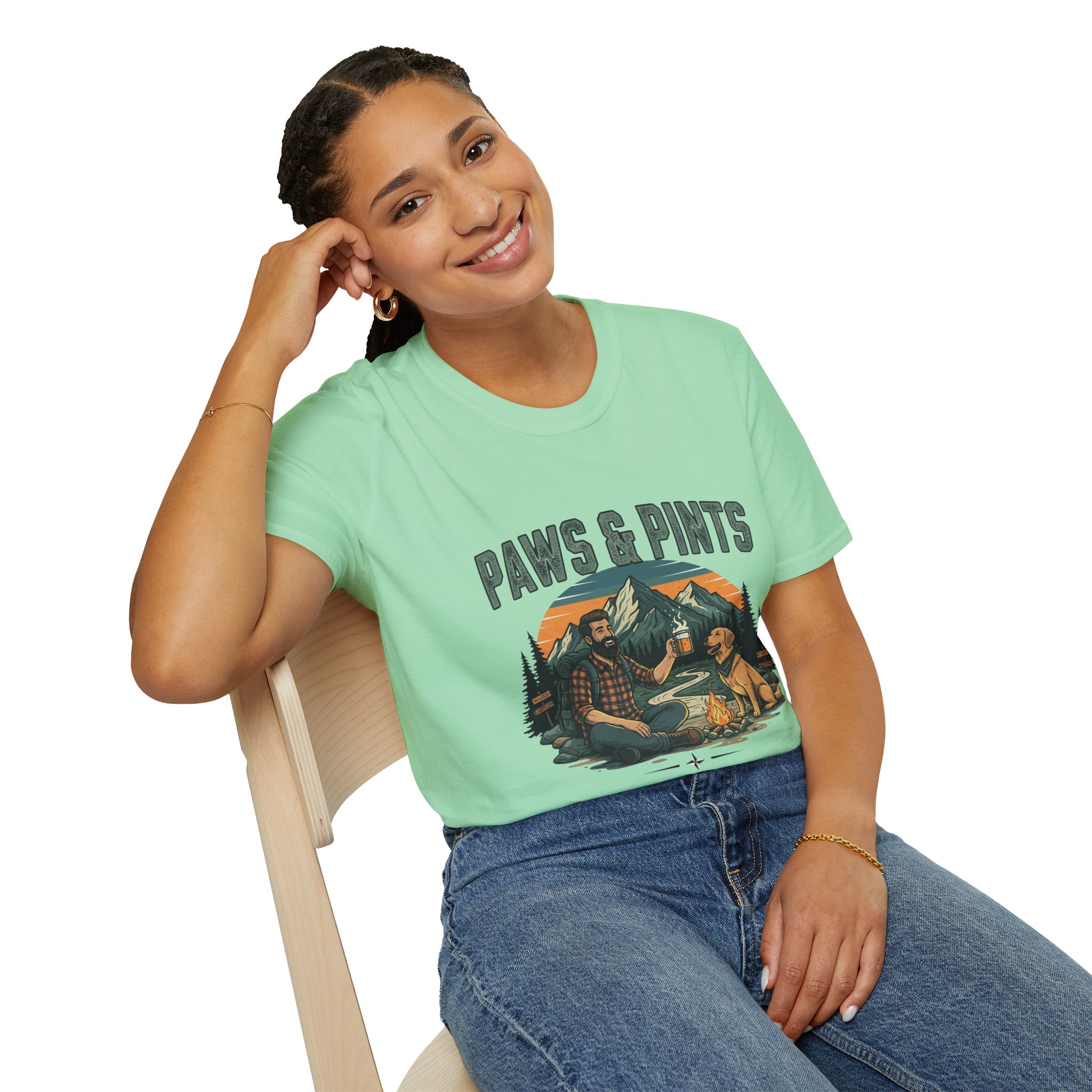 Raise your glass to life’s best duo — paws and pints! This “Paws & Pints” unisex softstyle t-shirt from Wiggly Whims celebrates the joy of outdoor adventures, loyal dogs, and craft beer moments under the open sky. Featuring a cozy campfire design with a man and his pup sharing a pint in front of a mountain sunset, this tee brings warmth and humor to your everyday look.